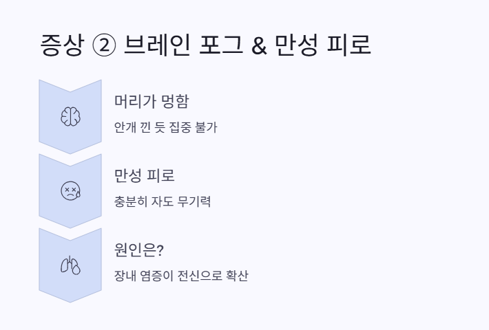 소화 문제뿐만이 아닙니다. 글루텐 섭취 후 머리가 멍하고 안개가 낀 것처럼 집중이 안 되는 '브레인 포그(Brain Fog)'를 경험할 수 있습니다.