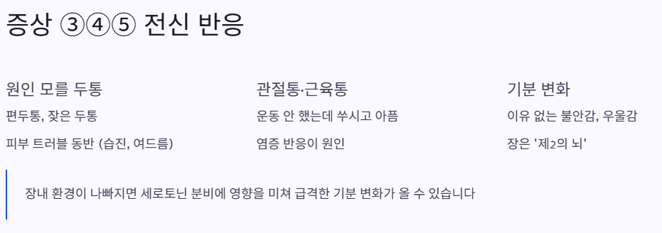 장은 '제2의 뇌'라고 불립니다. 장내 환경이 나빠지면 행복 호르몬인 세로토닌 분비에도 영향을 미쳐, 이유 없는 불안감, 우울감, 급격한 기분 변화를 겪을 수 있습니다.