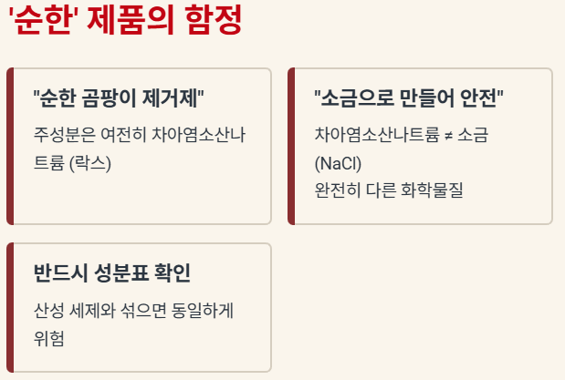 대부분의 '순한 곰팡이 제거제' 역시 주성분은 '차아염소산나트륨', 즉 락스입니다. 이름만 다를 뿐, 본질은 같기 때문에 산성 세제와 혼합하면 똑같이 위험한 염소가스가 발생합니다.