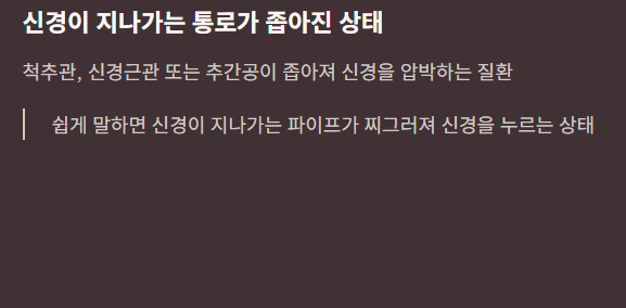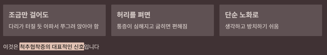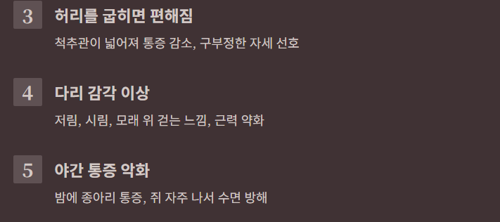 - 척추협착증: 허리를 앞으로 숙이면 편하고, 뒤로 젖히면 아픕니다. 누워서 다리를 들어 올리는 것은 비교적 쉽습니다.