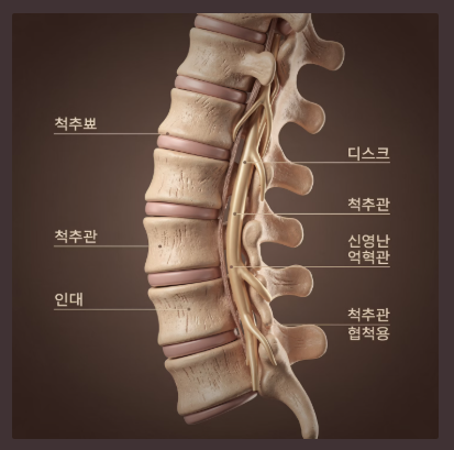 척추협착증은 척추 중앙의 척추관, 신경근관 또는 추간공이 좁아져서 허리의 통증을 유발하거나 다리에 복합적인 신경 증세를 일으키는 질환입니다. 쉽게 설명하면, 신경이 지나가는 통로(파이프) 안에 이물질이 끼거나 관 자체가 찌그러져 신경을 누르는 상태라고 볼 수 있습니다.