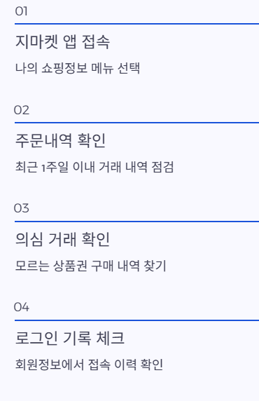 지마켓 앱이나 웹사이트에 접속하여 [나의 쇼핑정보] > [주문내역]을 확인하세요. 최근 1주일 내에 내가 구매하지 않은 '컬쳐랜드', '해피머니' 등의 상품권 구매 내역이 있는지 꼼꼼히 살펴봐야 합니다. 또한 [회원정보] 메뉴에서 의심스러운 로그인 기록이 있는지도 체크하는 것이 좋습니다.