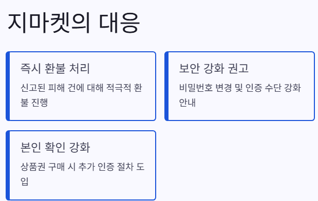 지마켓은 이번 사태 직후 홈페이지 공지 등을 통해 보안 강화를 당부했습니다. 단순히 비밀번호만 바꾸는 것이 아니라, 더욱 강력한 인증 수단을 도입할 것을 권고하고 있습니다.