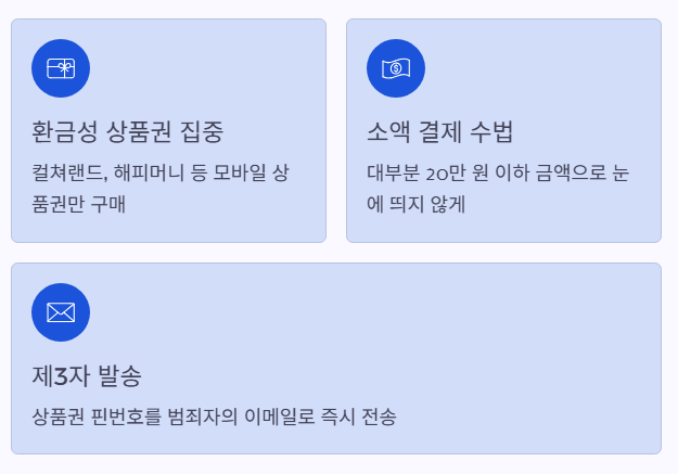 - 수법: 구매한 상품권(핀번호)을 피해자가 아닌 제3자의 이메일이나 전화번호로 즉시 발송