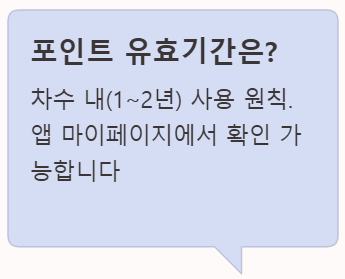 A. 적립된 포인트는 해당 차수(1년 또는 2년) 내에 사용하는 것이 원칙이며, 상세 기간은 앱 내 마이페이지에서 확인 가능합니다.