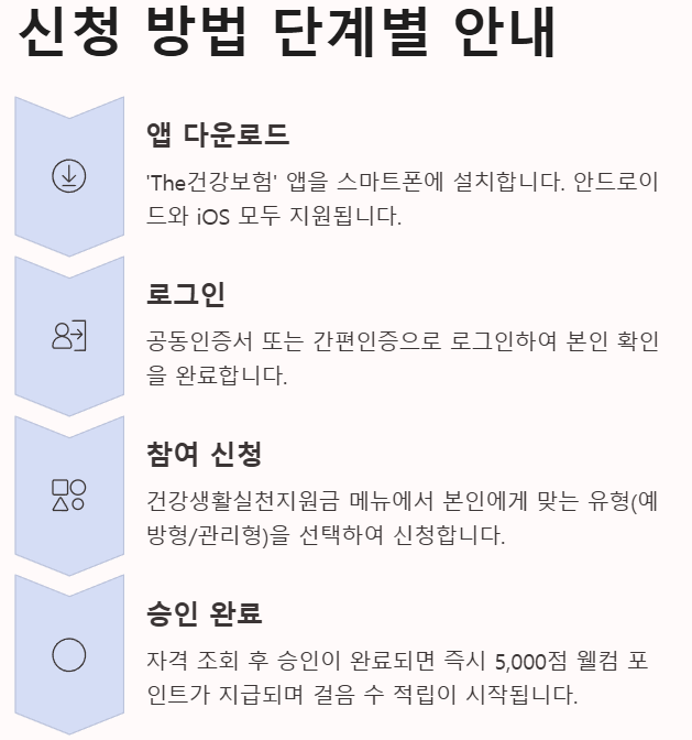 • 걸음 수 달성: 예방형 기준 하루 8,000보 이상을 목표로 잡는 것이 포인트 적립에 효율적입니다.