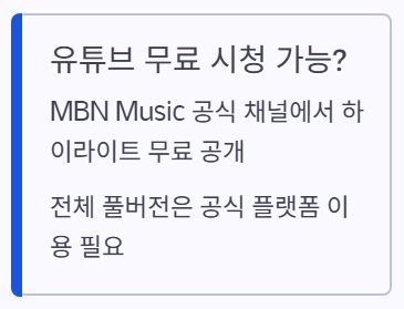 답변: 공식 채널인 'MBN Music'에서 주요 무대 하이라이트 영상은 무료로 공개됩니다. 하지만 전체 풀버전 다시보기는 공식 홈페이지나 OTT를 이용해야 합니다.